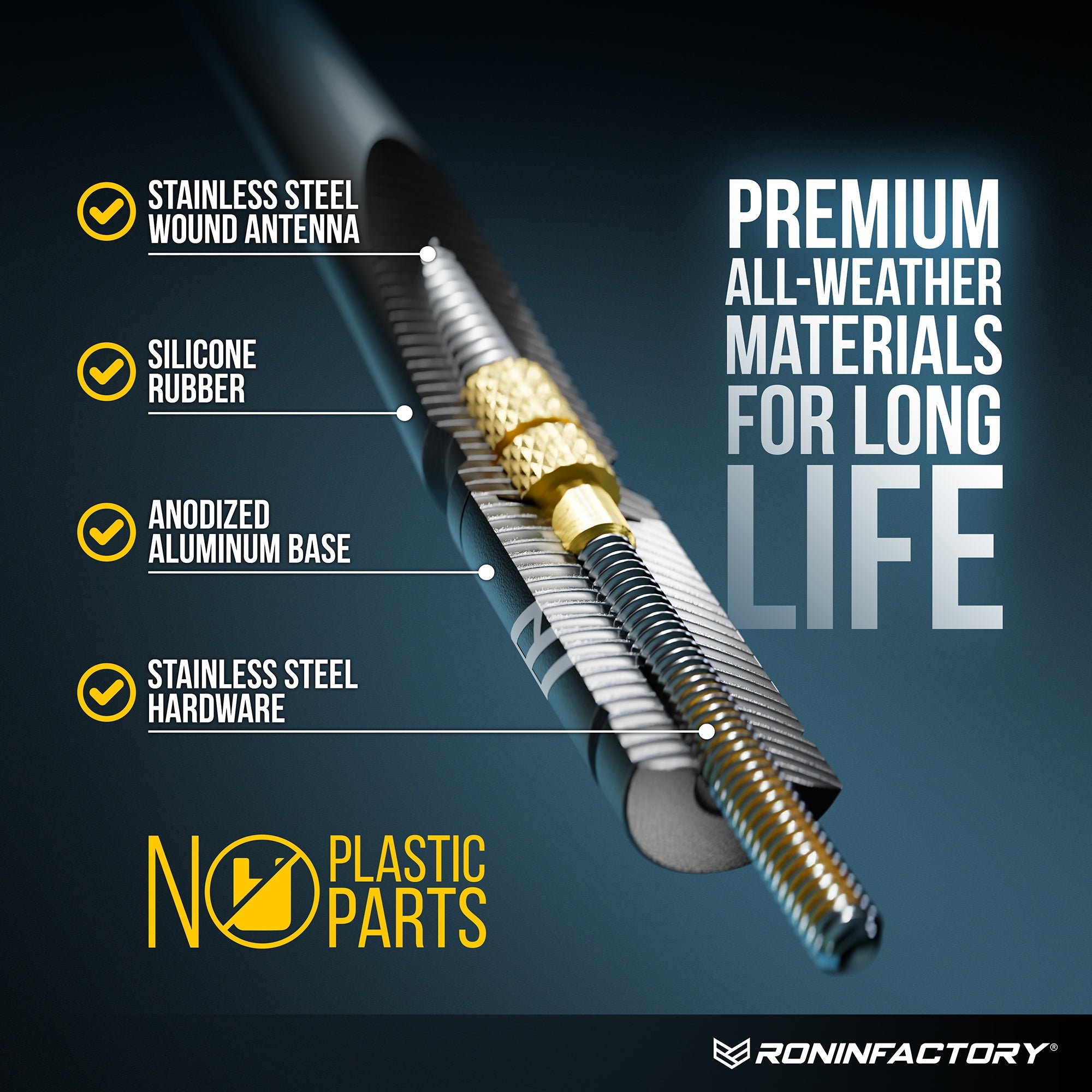 PREMIUM MATERIALS - No plastic used in this antenna! High grade silicone, brass, stainless steel and Military Grade anodized aluminum ensure that this antenna will last through all of your adventures! Fade resistant (may fade after long exposure to sunlight, SmartLock antennas have enhanced fade-proof coating)